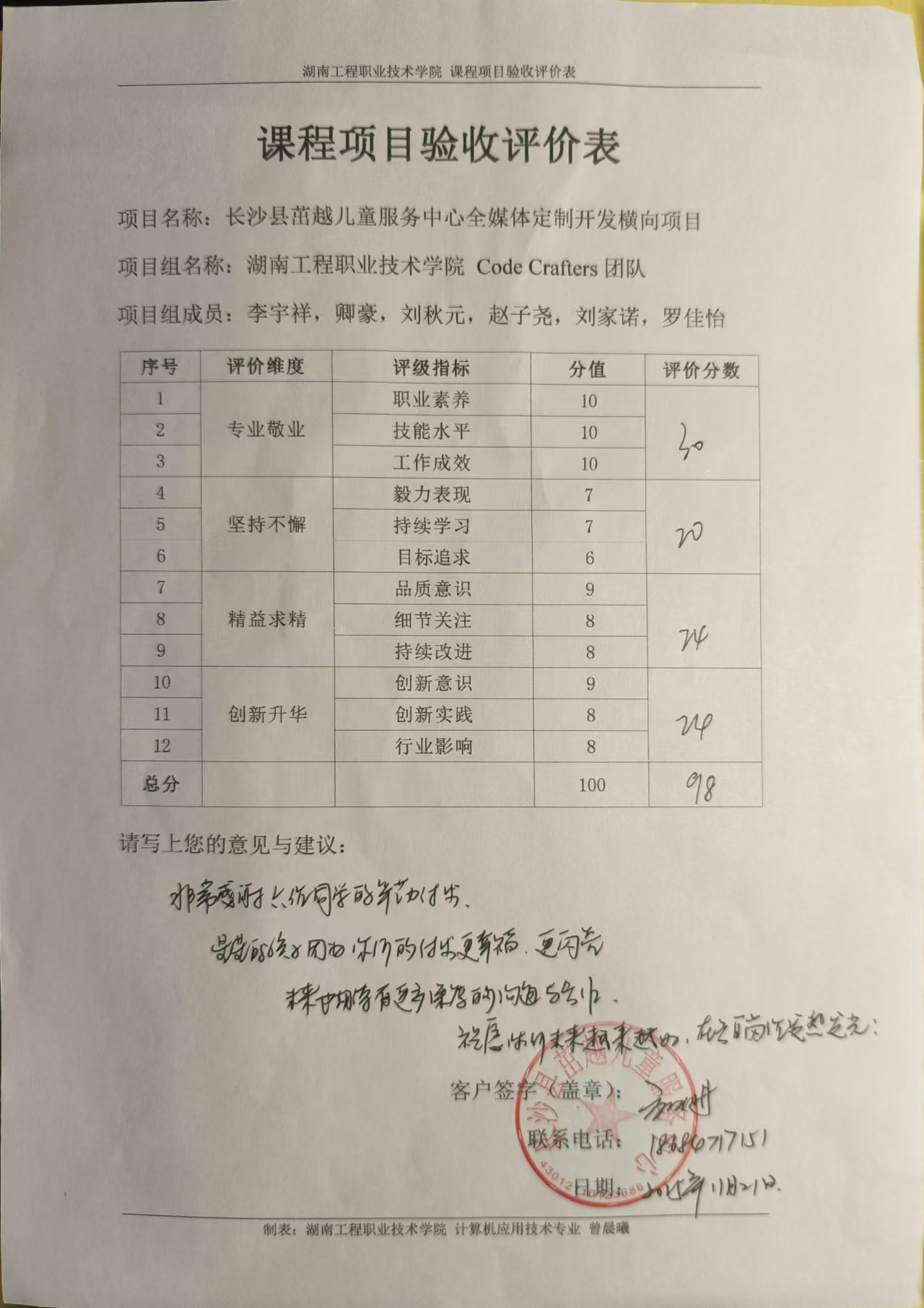 长沙县茁越儿童服务中心定制官网 评价表扫描版 李宇祥