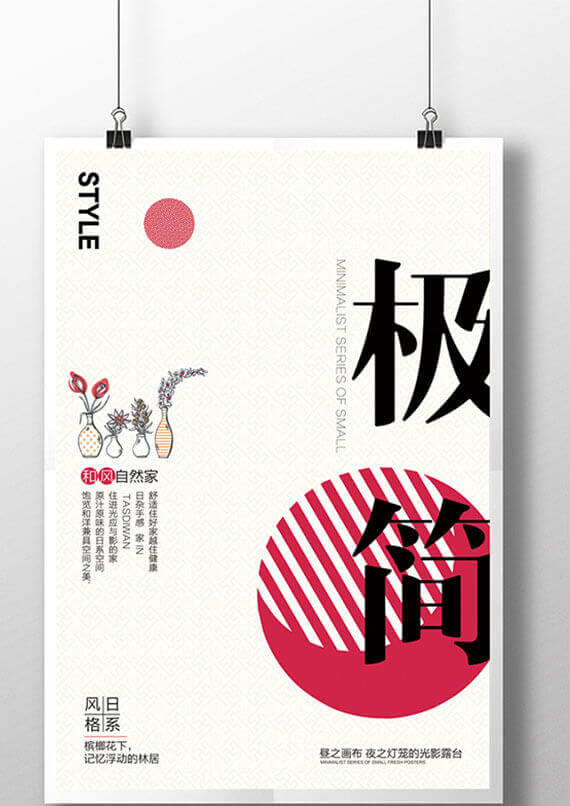 这是一张有关室内设计的海报设计。海报与室内设计风格一致,突出简约、日系风。 黑白灰加一个暖色调的紫红色,突出家的温暖。