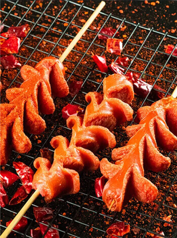 中国香肠按风味分,有五香香肠、玫瑰香肠、辣味香肠等,各具特色,老长沙香肠属于五香香肠种类。通过7:3(肥瘦比例)并加入各种天然香料灌制而成。长沙香肠适用于各种烹饪方式(蒸、煮、炸、炒),其制作方式较为复杂,这道经典菜肴仅有过年才能摆上长沙人的餐桌。其独特的造型和香辣的口味,老长沙大香肠立刻受到消费者的追捧,并成为当地地标性的美食。